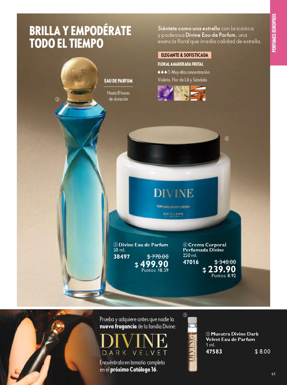 Eau de Toilette Divi ne Fragancias Oriflame - Ligeras y frescas notas de Bambú, petalos de Violeta y un toque de aroma de Hiedra se esconden bajo un corazón de Orquídea combinado con Almizcle Blanco y madera de Sándalo. Celebra la femineidad de la mujer con Divine. 50 ml.